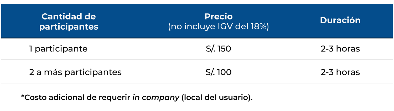 El costo de nuestra capacitación depende de la cantidad de participantes, así como se detalla a continuación: