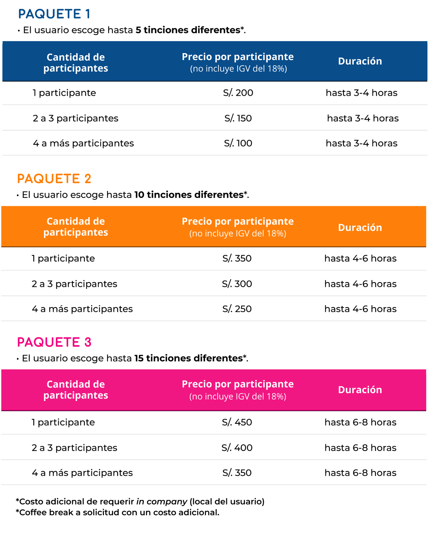El costo de nuestra capacitación depende del paquete elegido y de la cantidad de participantes, así como se detalla a continuación: